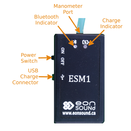 Plug a USB micro B charger into the ESM1. The "CHRG" LED is amber when the ESM1 is charging and green when complete. The power switch must be in the "OFF" position to charge.