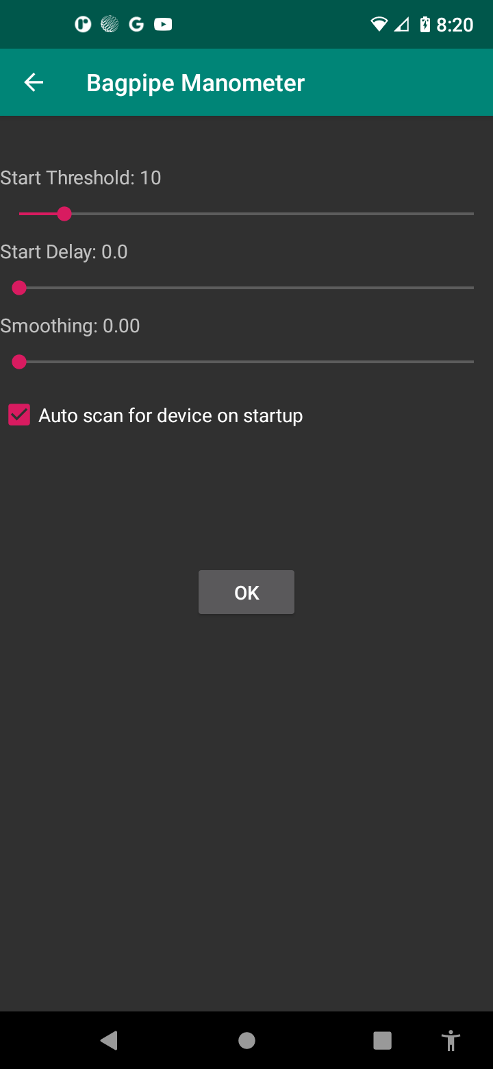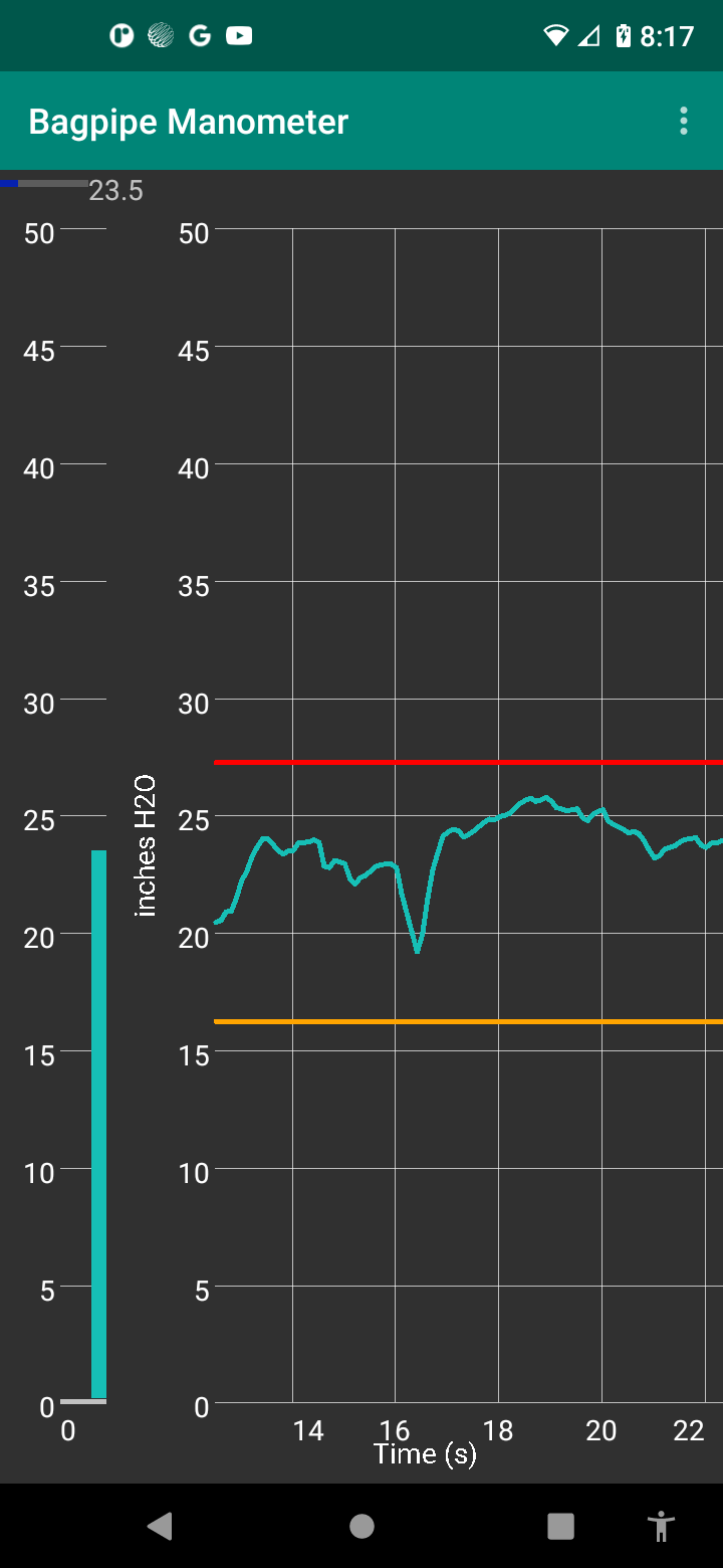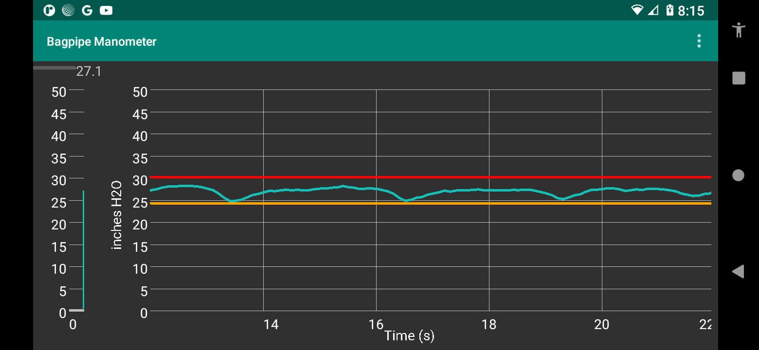 Threshold: is the pressure over which the app will start to make readings. The allows you to strike in drones and measure the quality of your attack. For instance, if you typically play at 30 inches of water, then you may set the threshold around 20 inches of water. When the pressure is below the threshold, then measurements stop allowing you to evaluate your cut-off.