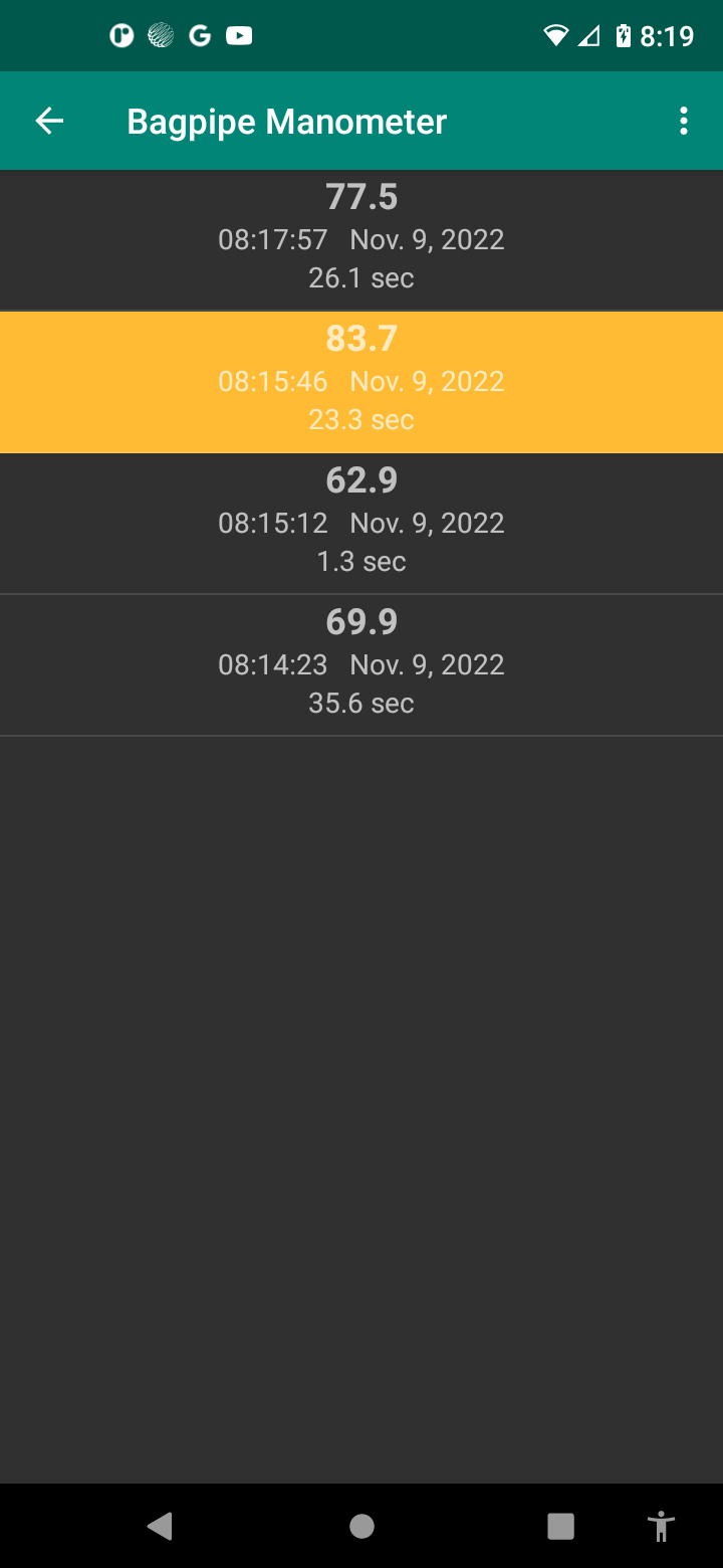 Each play recorded by the app is also scored based on how steady the blowing was. Each score is automatically saved and all scores can be reviewed by switching to the Score view. The score is a value out of 100 and also shows the start date/time as well as the play duration.